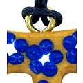 Croce tau in legno di ulivo con piccoli fiori in smalto blu dipinti a mano.