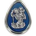 Portachiavi in metallo nichelato a forma di goccia con smalto blu che circonda la placchetta in metallo raffigurante San Cristoforo.
