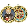 Il Portachiavi è costituito da un medaglione tondo in ulivo con da un lato l'immagine serigrafata di san Benedetto e sul retro la croce.