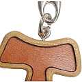 Portachiavi Tau di San Francesco d'Assisi in legno d'ulivo con intarsio centrale in cuoio.