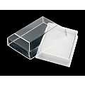 Scatolina portarosario in plastica rigida rettangolare con coperchio trasparente.