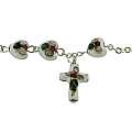 Bracciale Rosario cloisonnè con 11 grani a forma di cuore e la croce di altezza 2 cm con base di colore bianco e legatura in metallo.
