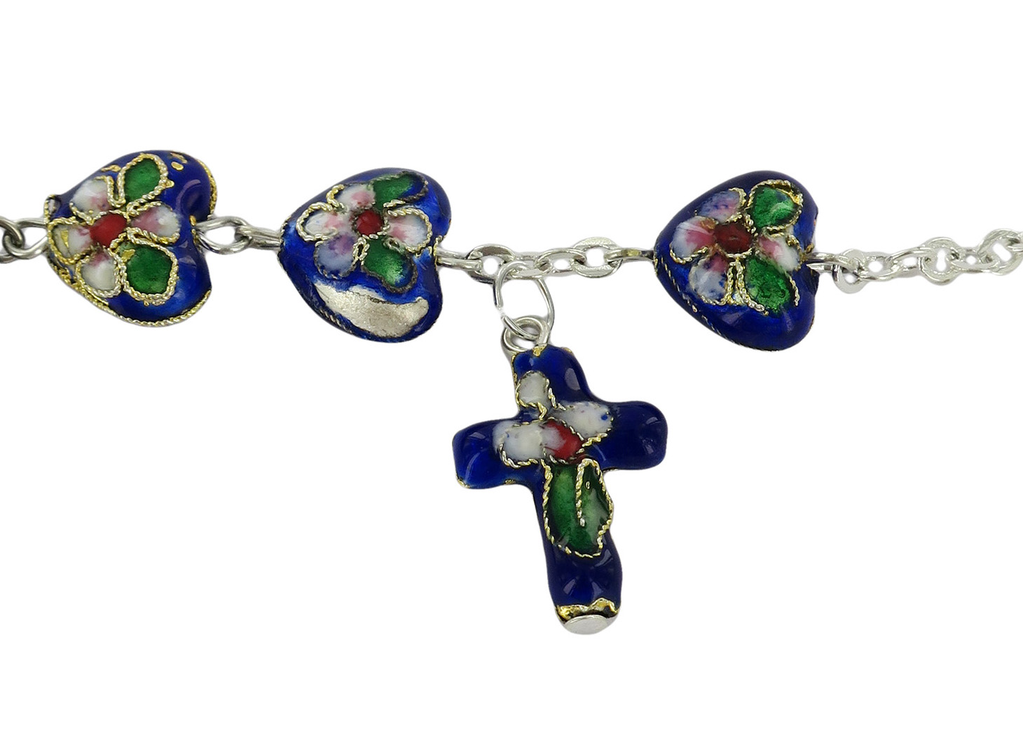 Bracciale Rosario cloisonnè con 11 grani a forma di cuore e la croce di altezza 2 cm con base di colore blu e