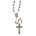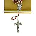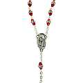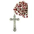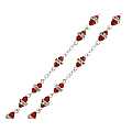 La luminosità di questo rosario,rilegato a mano in metallo argentato, è dovuta ai grani in semicristallo trasparente rosso impreziositi da un piccolo anello in strass bianchi.