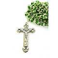 La luminosità di questo rosario,rilegato a mano in metallo argentato, è dovuta ai grani in semicristallo trasparente verde impreziositi da un piccolo anello in strass bianchi.