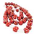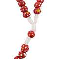 Rosario con grani tondi in legno rosso con fiore bianco e giallo e legatura a mano con filo bianco.