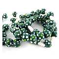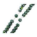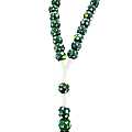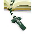 Rosario con grani tondi in legno verde con fiore bianco e giallo e legatura a mano con filo bianco.