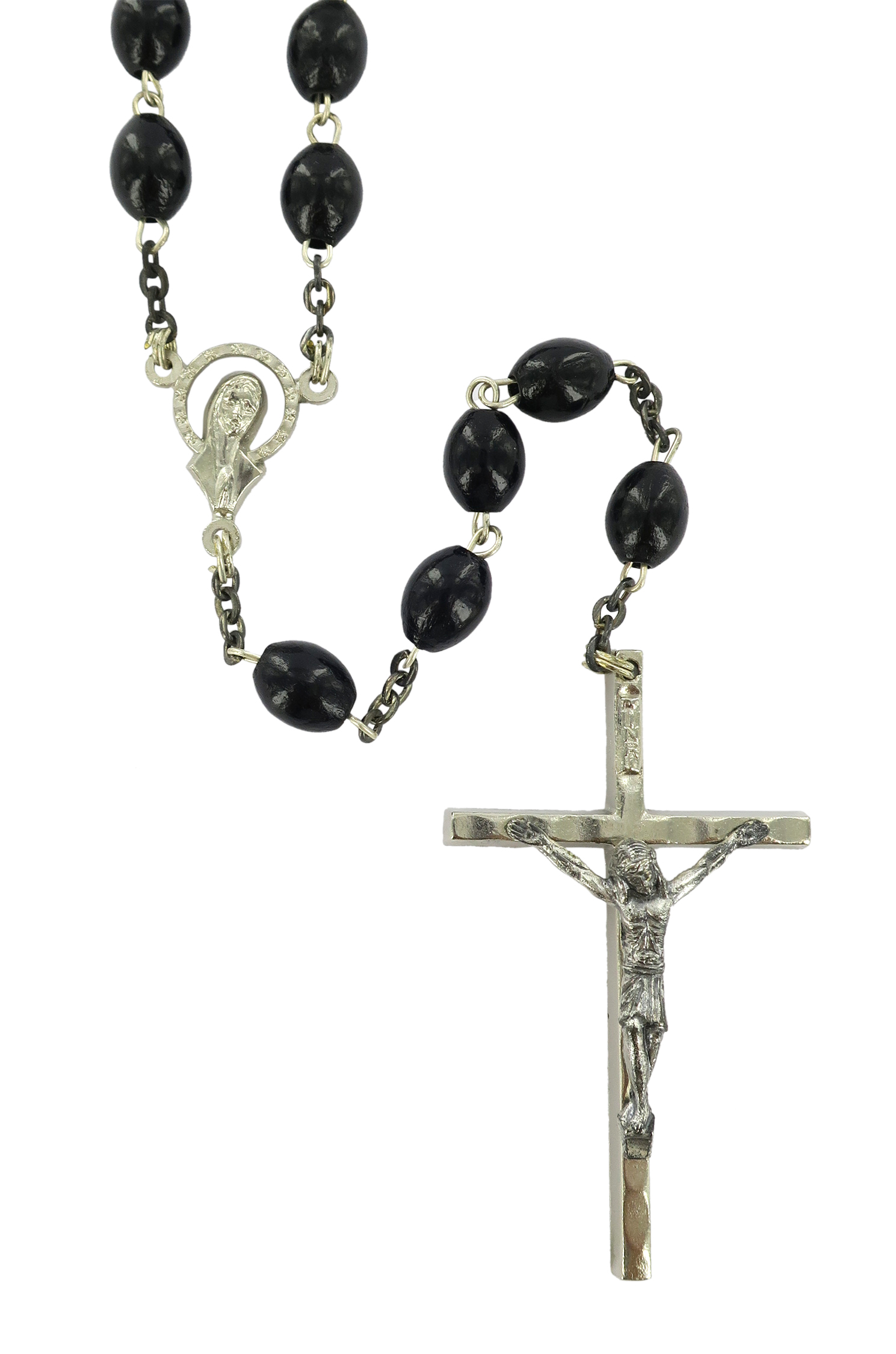 Rosario con legatura fatta a mano in ottone argentato con grani ovali in legno di colore nero. Sulla Crociera è visibile da un lato l'immagine della Madonna di Lourdes e dall'altro l'immagine della Madonna. Il prodotto è completamente realizzato in Italia. Il Santo Rosario è stato l'oggetto delle più vigile attenzione e premurosa sollecitudine da parte di tutti i Pontefici, che hanno visto il Rosario come una preghiera contemplativa che è insieme di lode e di supplica, efficace nel promuovere la vita cristiana e l'impegno apostolico. Anche Paolo VI e Giovanni Paolo II più volte hanno rivolto ai cristiani un appello perchè fossero innalzate supplici preghiere alla Beata Vergine del Rosario, per implorare da Dio il bene supremo della pace e il risveglio della vita cristiana.