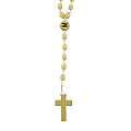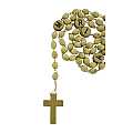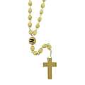 Il rosario ha i grani tondi in legno color naturale con legatura in ottone argentato e croce in legno che misura cm. 3