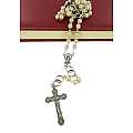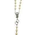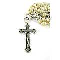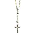 Il rosario si presenta con grani imitazione perla mm 7 di color bianco ecrù, i grani del pater sono rappresentati da due piccoli anelli che si intrecciano, croce con Cristo riportato, crociera con il Volto di Maria, tutto legato a mano in metallo ossidato.