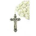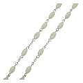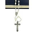 Il rosario in vera madreperla ovale, è legato a mano con filo di metallo argentato, croce con Cristo riportato e crociera ovale con Madonnina pregante.