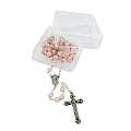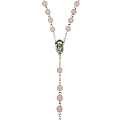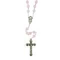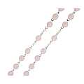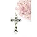 Il rosario è in legatura a mano con filo di metallo argentato, e i grani di mm 6 sono in vero quarzo rosa. Croce con Cristo riportato e crociera ovale con Madonnina pregante e su retro di essa vi è il Sacro Cuore di Gesù.