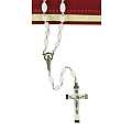 Rosario con legatura a macchina con grani ovali in plastica di colore bianco. Sulla Crociera è visibile l'immagine della Madonna di Lourdes. Il prodotto è completamente realizzato in Italia. Il Santo Rosario è stato l'oggetto delle più vigile attenzione e premurosa sollecitudine da parte di tutti i Pontefici, che hanno visto il Rosario come una preghiera contemplativa che è insieme di lode e di supplica, efficace nel promuovere la vita cristiana e l'impegno apostolico. Anche Paolo VI e Giovanni Paolo II più volte hanno rivolto ai cristiani un appello perchè fossero innalzate supplici preghiere alla Beata Vergine del Rosario, per implorare da Dio il bene supremo della pace e il risveglio della vita cristiana.