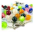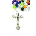 Rosario imitazione madreperla realizzato con grani tondi multicolori da mm 10 e rilegato in metallo argentato.