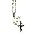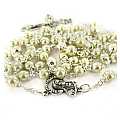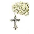 Rosario con grani tondi imitazione perla di colore bianco con coppiglie.I grani del rosario sono di mm 5.