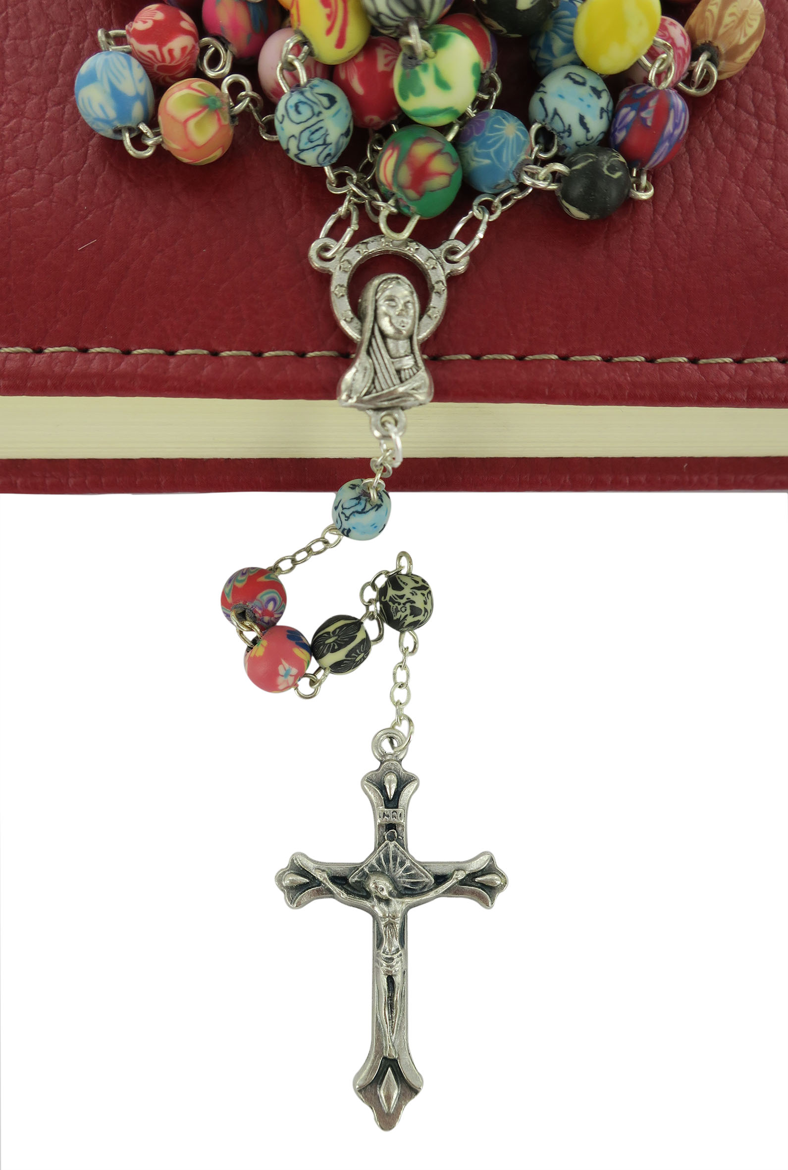 La particolarità di questo rosario è rappresentata dai grani tondi,di mm 8, in vetro satinato ognuno con colori e fantasie diverse.