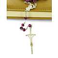 Rosario con grani tondi in vetro di colore fucsia il cui diametro è di 6 mm.