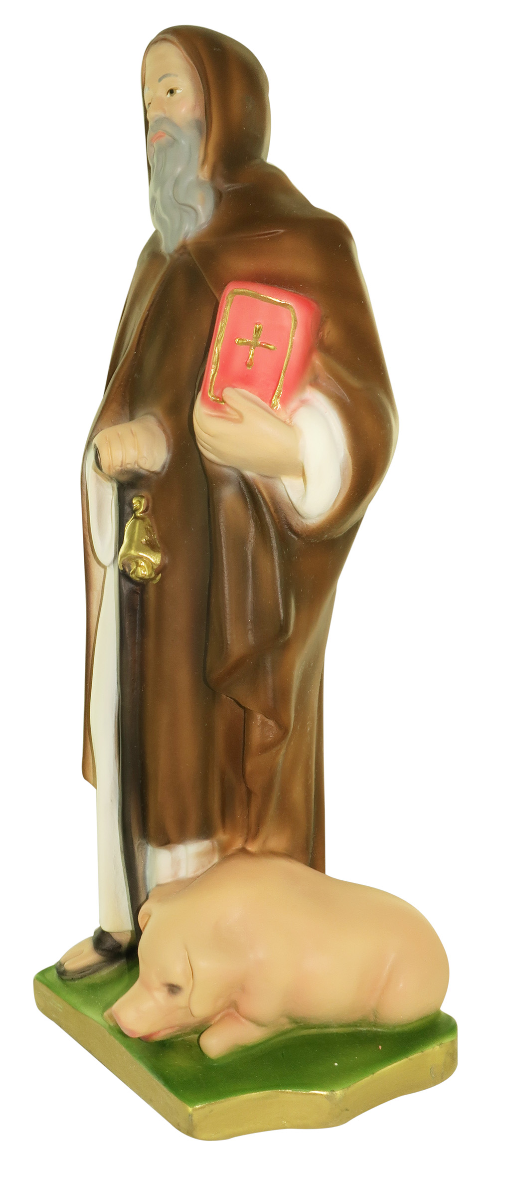 La statua, in gesso finemente dipinto a mano, raffigura Sant'Antonio Abate, primo abate ed eremita egiziano, ritenuto il fondatore del monachesimo cristiano. Celebrato il 17 gennaio, in questa raffigurazione è su piedistallo color oro e verde, veste un abito monacale marrone molto semplice, caratterizzato da delicate sfumature cromatiche. Come da iconografia, è qui rappresentato con un bastone, un maiale, un libro e una campanella.