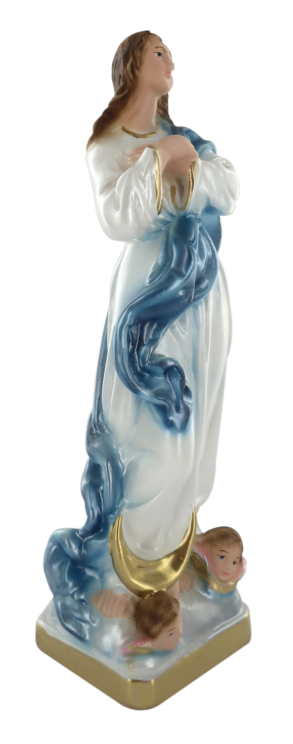 Questa statua della Madonna con angeli da 20 cm è realizzata artigianalmente in Italia e si distingue per la qualità della fattura e per il sapiente uso dei colori, adeguatamente dosati. L'effetto madreperlato rende le tinte molto lucenti e arricchisce la figura di suggestivi riflessi, donandole un aspetto elegante e pregevole. Adatta anche a piccole nicchie in ambienti dedicati al culto, la statuetta di Santa Maria degli Angeli è ideale per essere esposta in casa come soprammobile o in una vetrinetta, e può essere una gradita idea regalo per i devoti mariani. La luce delle fiammelle dei lumini o dei faretti esalterà l'effetto iridescente della sua rifinitura madreperlacea.