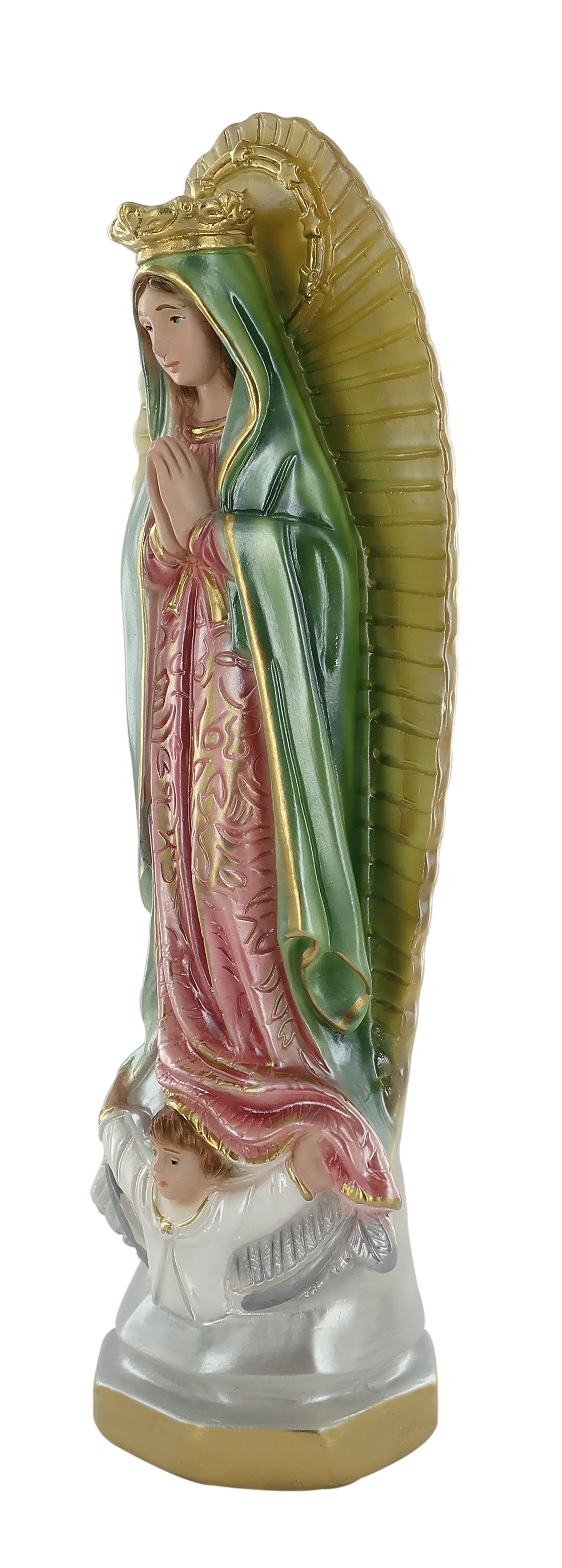 La statua, in gesso dipinto a mano e impreziosito da una rifinitura madreperlata, raffigura la Madonna di Guadalupe a mani conserte. A farle da sfondo, un'aura di color oro che contorna la sua figura. In questa rappresentazione, la "Morenita" appare all'indio Juan Diego: indossa un velo verde sfumato con un orlo color oro sopra una preziosa tunica rosa dai decori elaborati. Nella parte inferiore, sopra la base, trova posto il un bambino vestito di bianco e a braccia aperte, con delle ali color argento.
