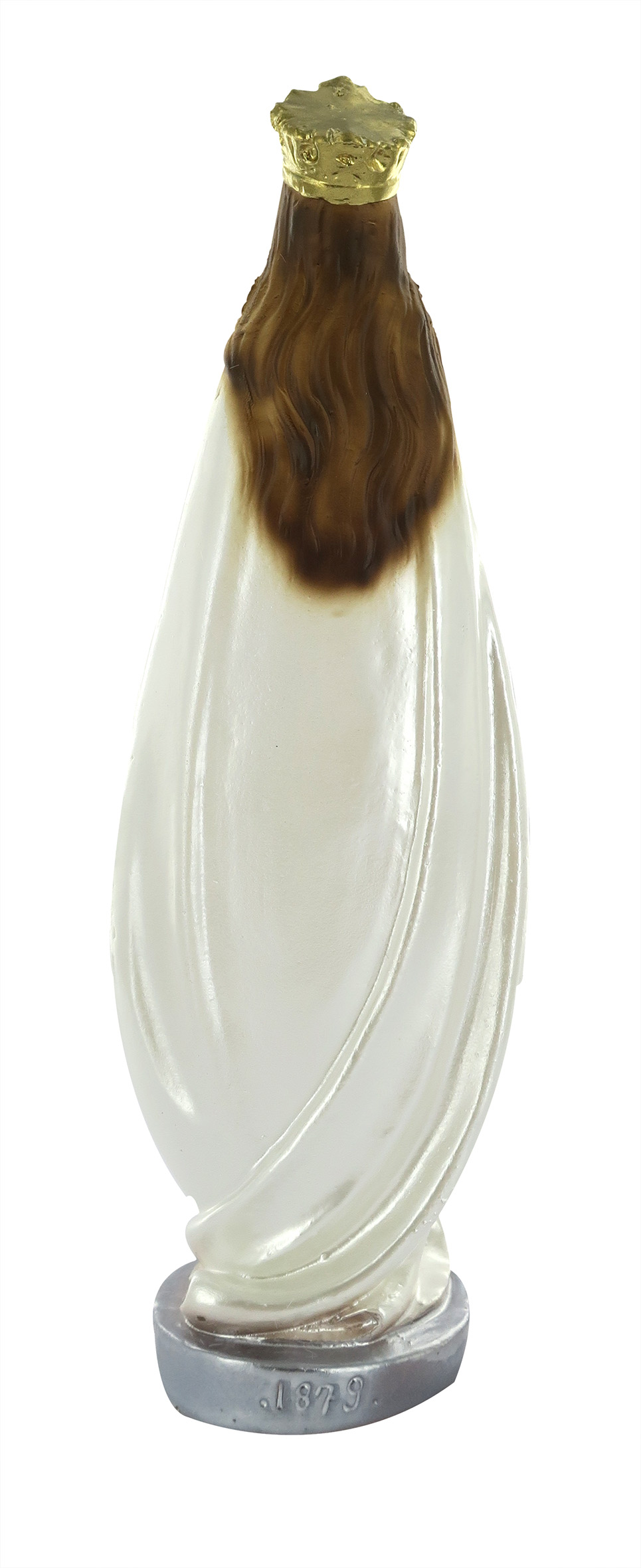 La statua, in gesso finemente dipinto a mano e impreziosito da una rifinitura madreperlata, raffigura la Madonna di Knock e celebra l'apparizione mariana avvenuta nell'agosto del 1879 nella località di Knock, in Irlanda, diventata la meta di pellegrinaggio cattolico principale dell'isola. Indossa una veste bianchissima molto semplice e ricca di pieghe, impreziosita da dettagli in color oro e una corona. Secondo il racconto della testimone, Mary McLoughlin, la Madonna apparve insieme a S. Giuseppe e a S. Giovanni.