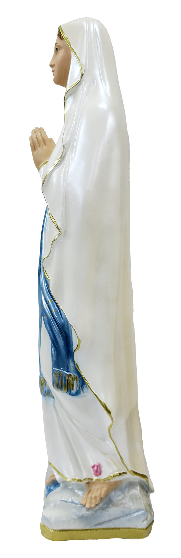 La statua, in gesso finemente dipinto a mano e impreziosito da una rifinitura madreperlata, raffigura la Madonna di Lourdes scalza e a mani congiunte sopra a un piedistallo grigio che riproduce le fattezze di una superficie rocciosa. Rappresentata come apparì a Bernadette Soubirous nella nota località francese di Lourdes nel 1858, la Nostra Signora del Rosario indossa una veste bianca coperta da un lungo copricapo del medesimo colore, bordato di color oro. A cingerle la vita, una cintura azzurra che spicca sullo sfondo immacolato insieme al rosario al braccio. I suoi indumenti vantano un'attenzione particolare alla resa delle pieghe e delle delicate sfumature, che donano grande plasticità e pregio alla rappresentazione.
