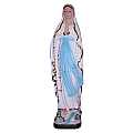La statua, in gesso finemente dipinto a mano e impreziosito da una rifinitura madreperlata, raffigura la Madonna di Lourdes scalza e a mani congiunte sopra a un piedistallo grigio che riproduce le fattezze di una superficie rocciosa. Rappresentata come apparì a Bernadette Soubirous nella nota località francese di Lourdes nel 1858, la Nostra Signora del Rosario indossa una veste bianca coperta da un lungo copricapo del medesimo colore, bordato di color oro. A cingerle la vita, una cintura azzurra che spicca sullo sfondo immacolato insieme al rosario al braccio. I suoi indumenti vantano un'attenzione particolare alla resa delle pieghe e delle delicate sfumature, che donano grande plasticità e pregio alla rappresentazione.