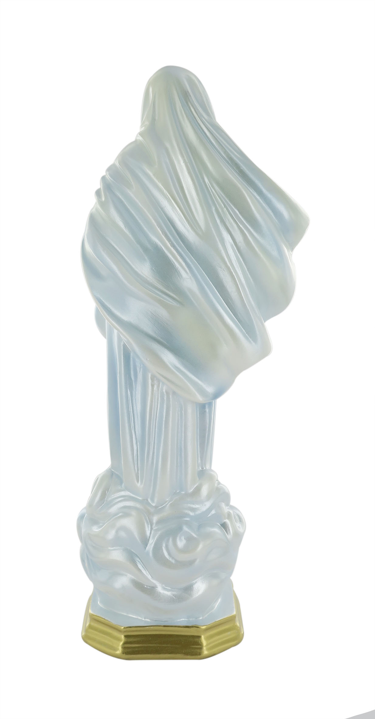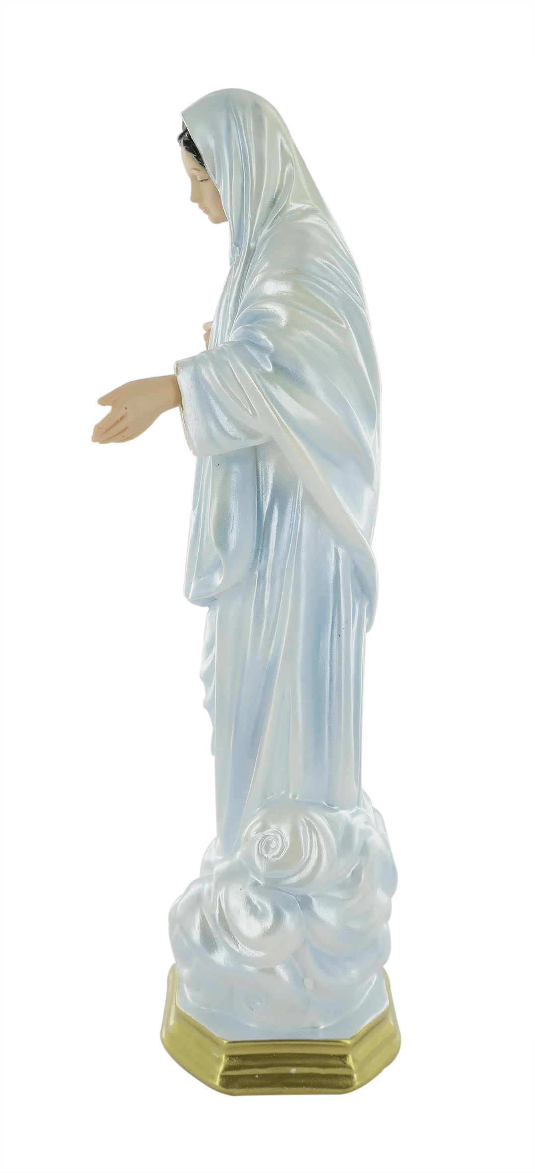 Questa statua della Madonna di Me?ugorje di 33 cm d'altezza è realizzata artigianalmente in Italia e si distingue per la qualità della fattura e per il sapiente uso dei colori. L'effetto madreperlato rende le tinte molto lucenti e arricchisce la figura di suggestivi riflessi, donandole un aspetto elegante e raffinato.