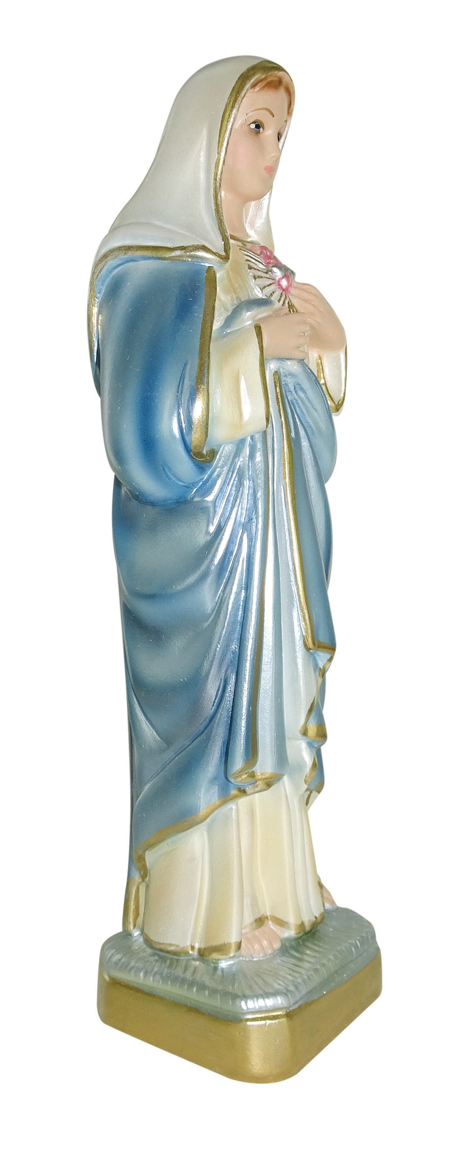 La statua, in gesso finemente dipinto a mano impreziosito da una rifinitura madreperlata, raffigura il Sacro Cuore di Maria, devozione molto cara ai cattolici. Il cuore della Vergine, chiamato anche “Cuore Immacolato di Maria”, simboleggia il dolore provato dalla Santa Madre per la morte del figlio ed è spesso rappresentato trafitto da una spada. Gli indumenti vantano un'attenzione particolare alla resa delle pieghe e delle delicate sfumature, che donano grande plasticità alla figura.