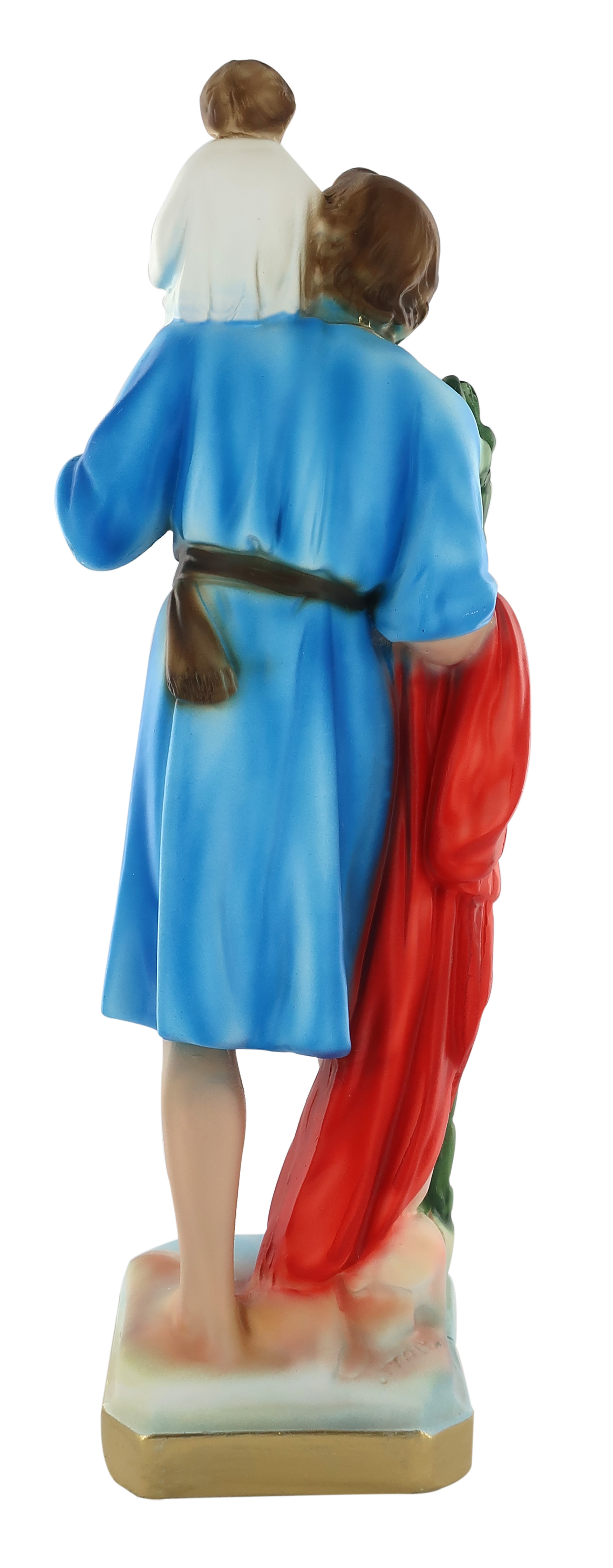 Questa statua di San Cristoforo da circa 30 cm è realizzata artigianalmente in Italia e si distingue per la qualità della fattura e per il sapiente uso dei colori. Le linee delle vesti e la resa delle loro pieghe donano plasticità alla figura e la rendono suggestiva. Ideale per piccole nicchie in luoghi di culto, la statua di S. Cristoforo può anche essere esposta in casa come soprammobile o in una vetrinetta. Sarà particolarmente apprezzata come idea regalo dai devoti di questo personaggio. La luce delle fiammelle dei lumini o dei faretti esalterà la fisicità del soggetto, aumentandone l'impatto visivo.