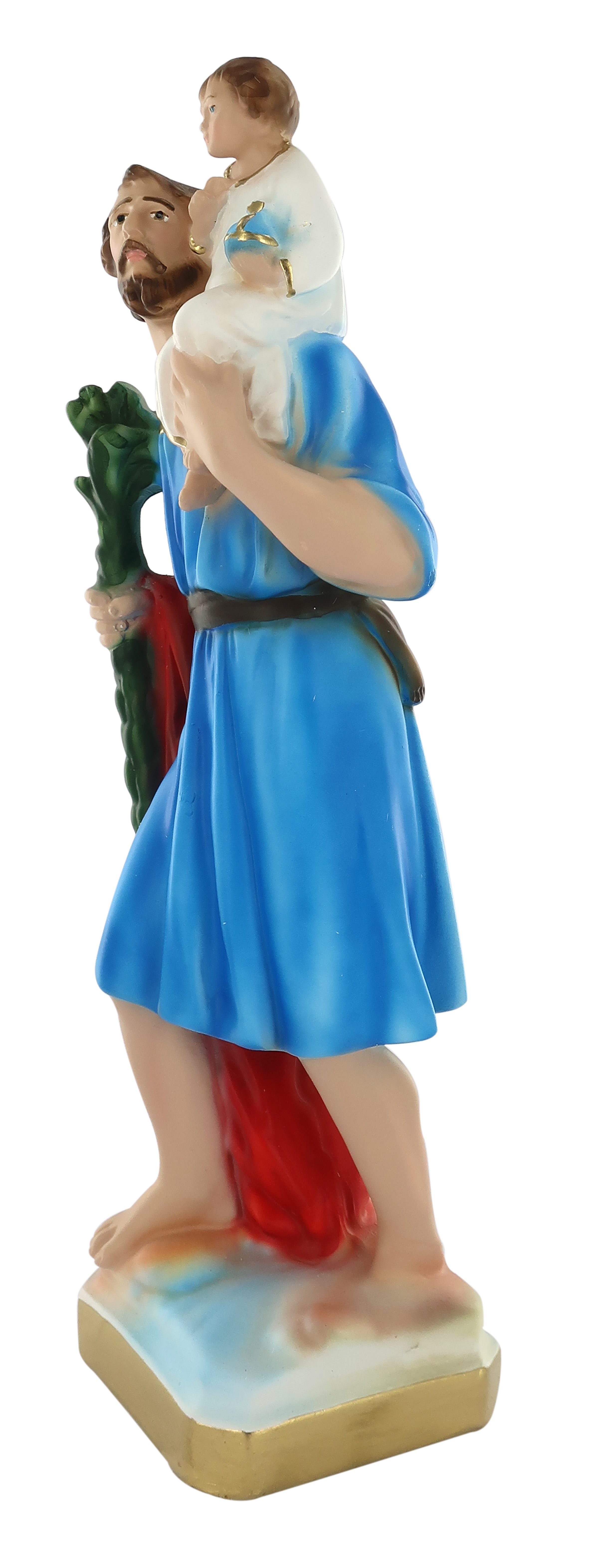 La statua, in gesso finemente dipinto a mano, raffigura San Cristoforo, martire in Licia durante la persecuzione dell'imperatore Decio e patrono di viaggiatori, ferrovieri e automobilisti. Gli indumenti vantano un'attenzione particolare alla resa delle pieghe e delle delicate sfumature, che donano grande plasticità alla figura.