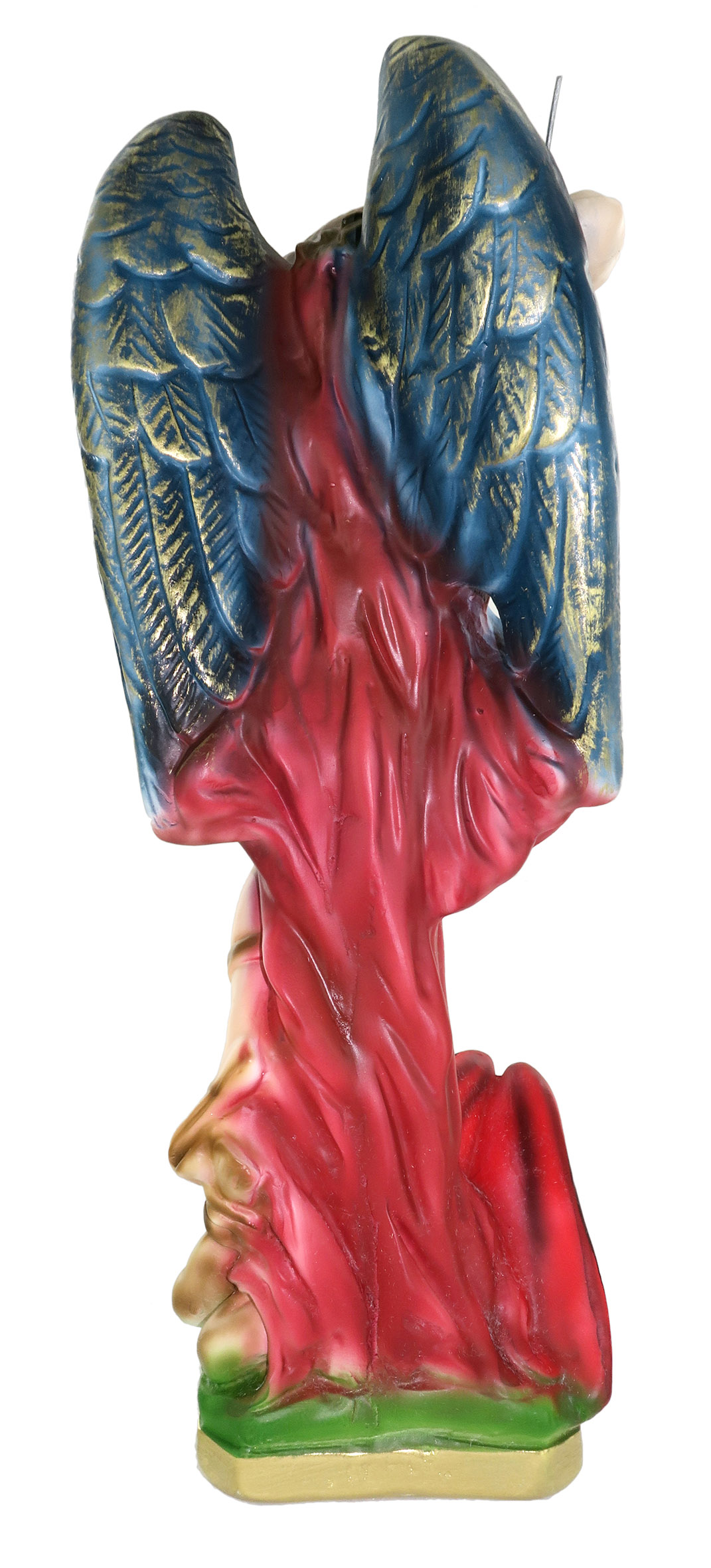 La statua, in gesso finemente dipinto a mano, raffigura San Michele, Arcangelo e Principe delle milizie celesti. Lo stesso titolo di Arcangelo è stato attribuito a S. Gabriele e a S. Raffaele. La sua funzione è quella di difesa della fede in Dio contro le orde di Lucifero (diventato Satana), da cui Michele si è distaccato dopo la scissione degli Angeli da Dio. Il soggetto alato, che imbraccia la propria lancia, è qui rappresentato mentre calpesta il male, rappresentato da una creatura marrone dalle ali rosse. Michele veste un mantello rosso da cui spiccano due ali sfumate da tocchi di color oro e indossa un'armatura color argento.