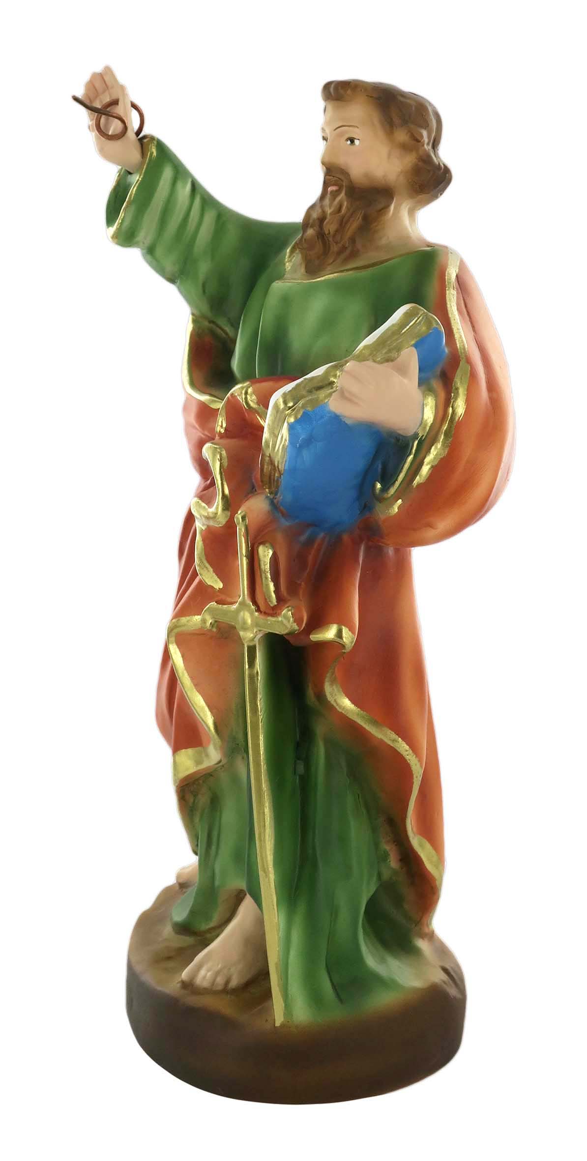 Questa statua di San Paolo da 25 cm è realizzata artigianalmente in Italia e si distingue per la qualità della sua fattura, il sapiente uso di colori sfumati e la resa accurata delle linee delle vesti. Tali caratteristiche contribuiscono a donare profondità e corpo al soggetto. Adatta anche a piccole nicchie in luoghi di culto, può inoltre essere esposta in casa come soprammobile o in una vetrinetta. La statua di S. Paolo è una gradita idea regalo per i suoi devoti. Lumini o faretti esalteranno la tridimensionalità del personaggio e ne aumenteranno l'impatto visivo.