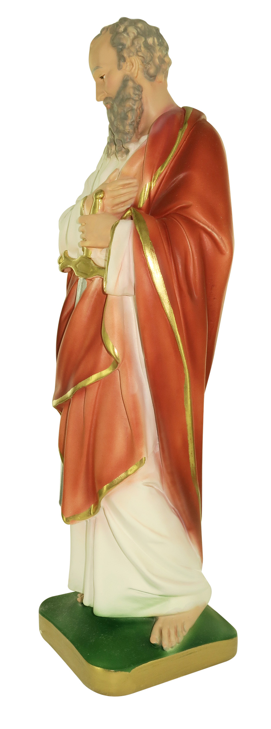 La statua, in gesso finemente dipinto a mano, raffigura San Paolo, apostolo, scrittore e teologo cristiano che pose i fondamenti della Chiesa, di cui S. Pietro è stato primo Papa. Qui rappresentato su un piedistallo color oro e verde, S. Paolo indossa vesti arancioni e bianche dal bordo di color oro e ha con sè una spada.