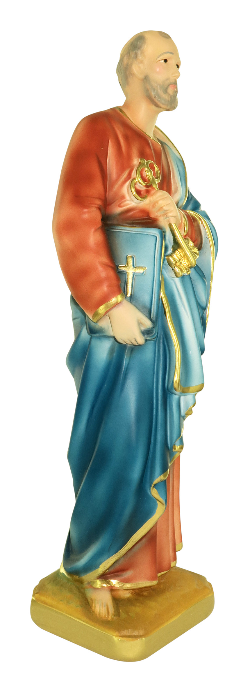 Questa statua di S. Pietro da 30 cm è realizzata artigianalmente in Italia e si distingue per la qualità della sua fattura, il sapiente uso di colori sfumati e la resa accurata delle linee delle vesti. Tali caratteristiche contribuiscono a donare profondità e corpo al soggetto. Adatta anche a piccole nicchie in luoghi di culto, può inoltre essere esposta in casa come soprammobile o in una vetrinetta. La statua di San Pietro è una gradita idea regalo per i suoi devoti. Lumini o faretti esalteranno la tridimensionalità del personaggio e ne aumenteranno l'impatto visivo.