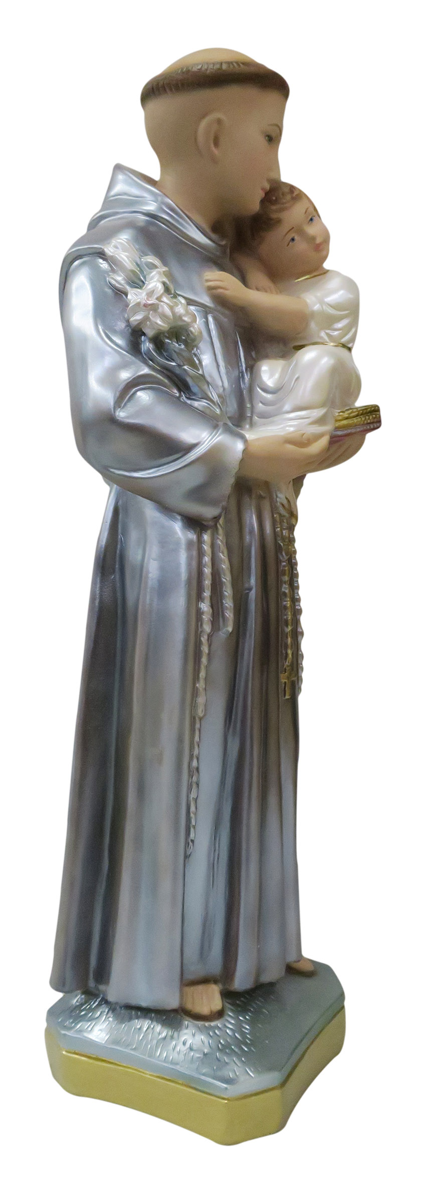 La statua, in gesso finemente dipinto a mano e impreziosito da una rifinitura madreperlata, raffigura Sant'Antonio, il francescano nato a Lisbona e spesso associato alla città di Padova che lo ha ospitato durante i suoi ultimi anni di vita terrena. Il santo, proclamato tale da papa Gregorio IX nel 1232 e dichiarato "dottore della Chiesa" nel 1946, è su un piedistallo, con un bambino in braccio, un rosario, un libro e un mazzo di gigli. La figura del bimbo, vestita di bianco, spicca rispetto al colore della veste dell'uomo, di colore più scuro. Gli indumenti vantano un'attenzione particolare alla resa delle pieghe e delle delicate sfumature, che donano grande plasticità e realismo alla figura.
