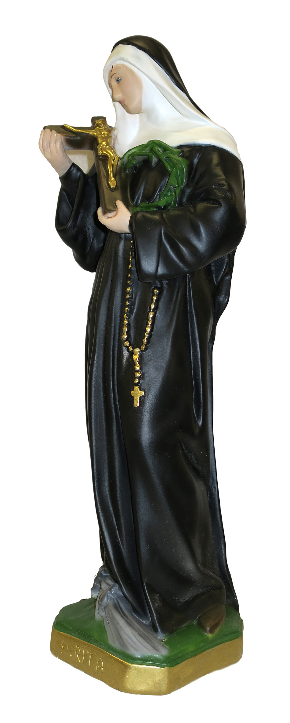 La statua, in gesso finemente dipinto a mano, raffigura Santa Rita, una delle figure più importanti, molto cara ai cattolici. Conosciuta semplicemente anche come "Rita da Cascia", è stata proclamata santa da papa Leone XIII nel 1900. Rimasta vedova, decise di prendere i voti ed entrare nel monastero agostiniano di Santa Maria Maddalena, a Cascia. Dopo aver ricevuto in fronte una spina della corona del crocifisso, ne porterà a vita il segno sottoforma di stigmate. Da qui deriva l'iconografia che spesso la associa alle api, alle rose e, appunto, alla spina. Qui è rappresentata con una corona di spine e un crocifisso in mano, di color oro e marrone. Il copricapo bianco spicca sul nero della veste.