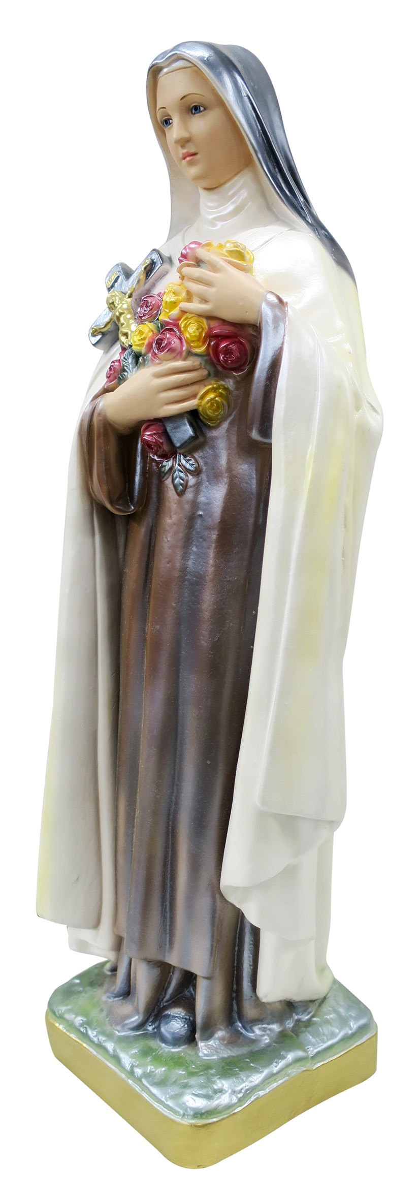 La grande statua, in gesso finemente dipinto a mano e impreziosito da una rifinitura madreperlata, raffigura Santa Teresa di Lisieux, patrona dei missionari, dei malati di AIDS/HIV, della Russia e della Francia. Proclamata santa da Papa Pio XI nel 1925, è qui ritratta su un piedistallo color oro, indossa la tunica scura delle Carmelitane Scalze, coperta da un lungo, candido mantello. Regge in mano i suoi fiori simbolo, le rose, insieme a un crocifisso. Gli indumenti vantano un'attenzione particolare alla resa delle pieghe e delle delicate sfumature, che donano grande plasticità e profondità alla rappresentazione.