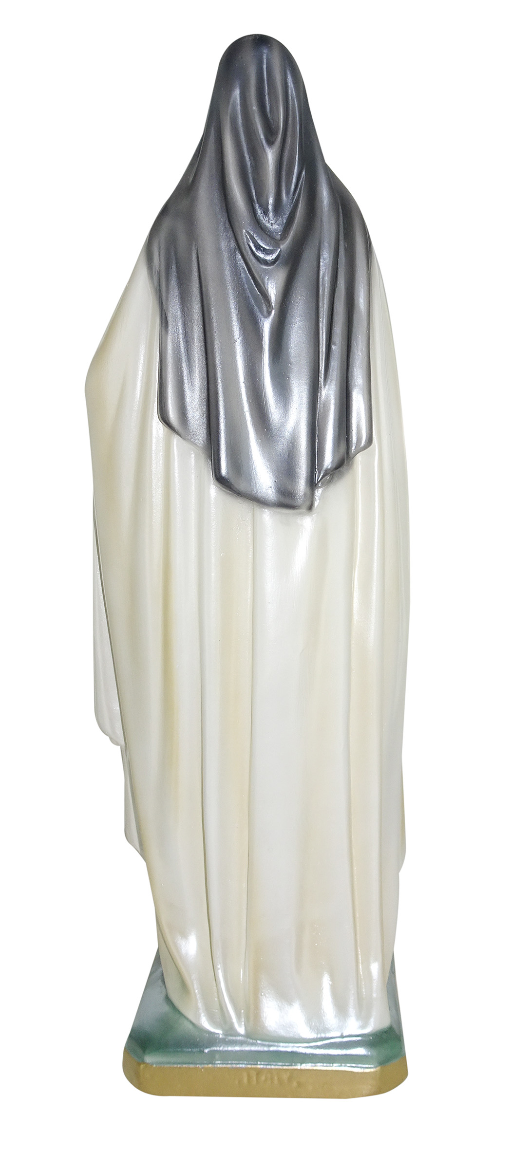 Questa statua di S. Teresa di Lisieux da 40 cm è realizzata artigianalmente in Italia e si distingue per la qualità della fattura e per il sapiente uso dei colori, adeguatamente dosati. L'effetto madreperlato rende le tinte molto lucenti e arricchisce la figura di suggestivi riflessi, donandole un aspetto elegante e pregevole. La statua di Teresa di Gesù Bambino e del Volto Santo è particolarmente indicata per essere esposta nelle nicchie di luoghi di culto. La luce delle fiammelle dei lumini, candele o faretti esalterà l'effetto iridescente della sua rifinitura madreperlacea.