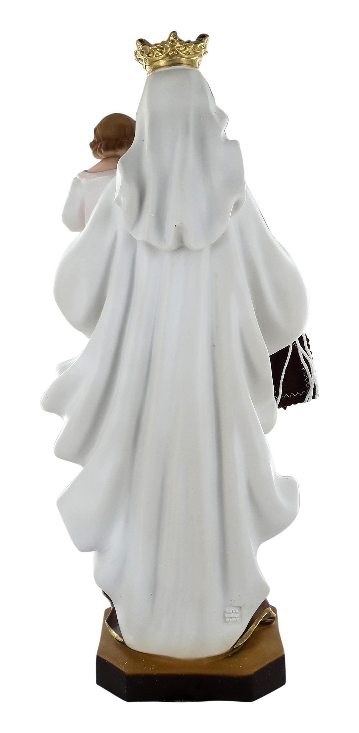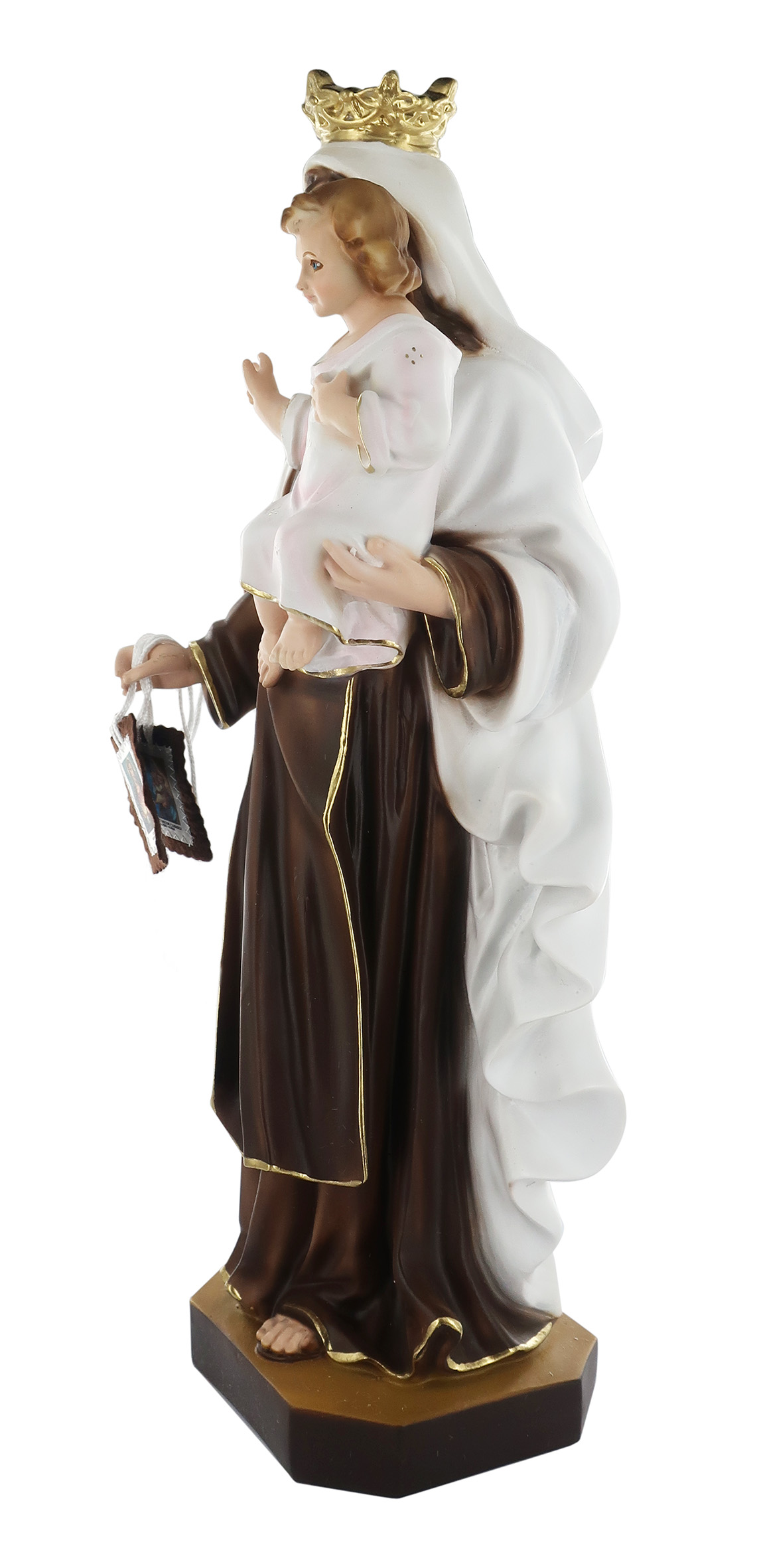 La statua, in resina finemente dipinta a mano, raffigura la Madonna del Monte Carmelo, una delle rappresentazioni della Vergine più sentite, oggetto di devozione anche da parte di san Giovanni Paolo II. Gli indumenti vantano un'attenzione particolare alla resa delle pieghe e delle delicate sfumature, che donano grande plasticità alla rappresentazione. Tale devozione è legata allo scapolare, che si dice sia stato dato dalla Vergine a Simone Stock.
