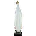 Questa statua della Vergine di Fatima di circa 27 cm d'altezza è prodotta a Fatima, in Portogallo, è realizzata in poliestere ed è dipinta a mano. Il volto della Vergine è molto delicato e la donna ha le mani conserte, in segno di preghiera. I suoi abiti sono abbelliti da bordi in color oro, ricche di pieghe e sfumature molto tenui di color giallo e azzurro. Sul capo, la Vergine di Fatima porta una corona metallica di color oro che contribuisce a far risaltare ulteriormente il suo volto. Lungo il vestito, si nota il rosario di color argento, ben realizzato, elemento classico di questa raffigurazione mariana. La nuvola su cui poggia vanta sfumature molto delicate di color rosa.