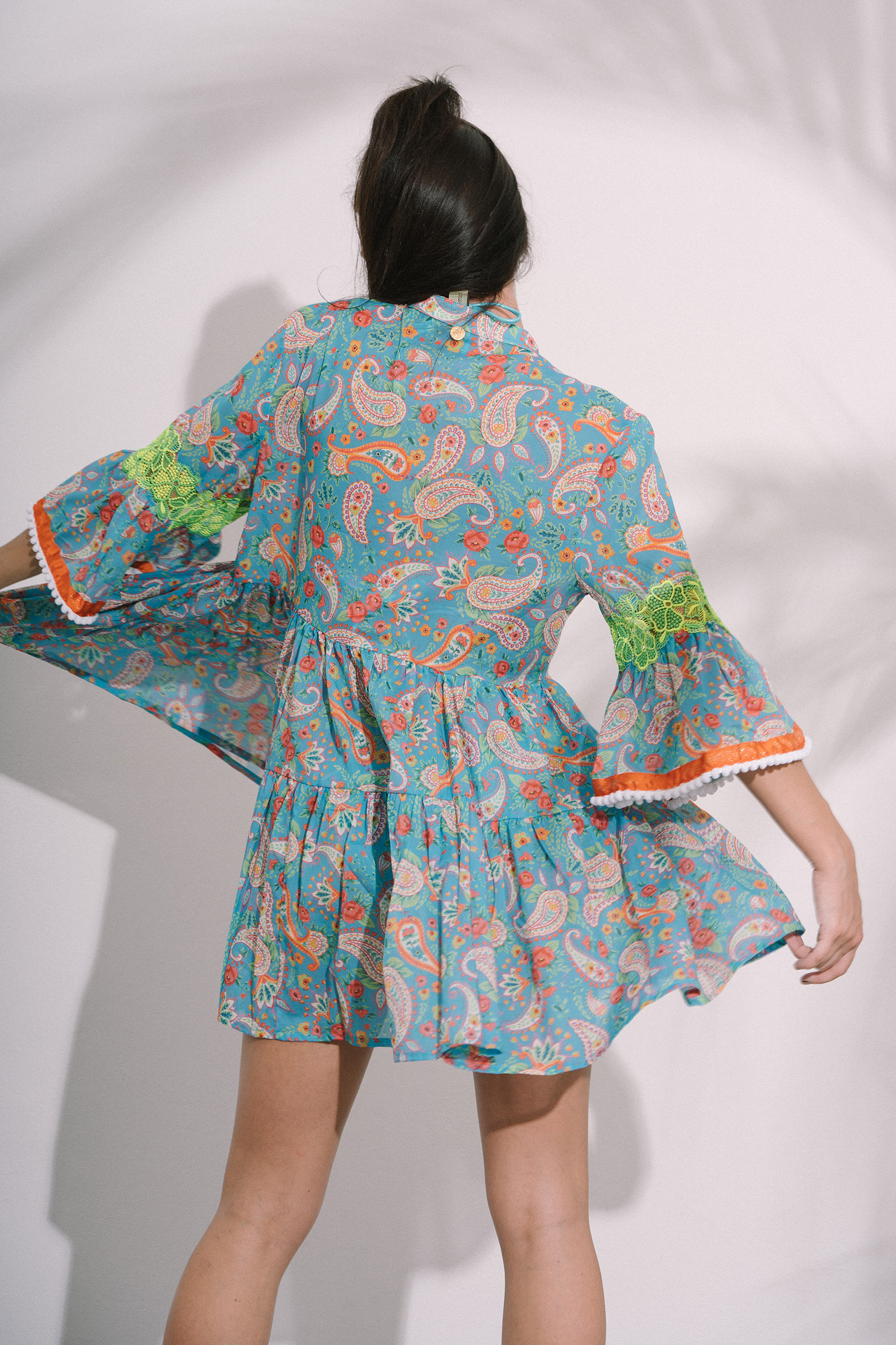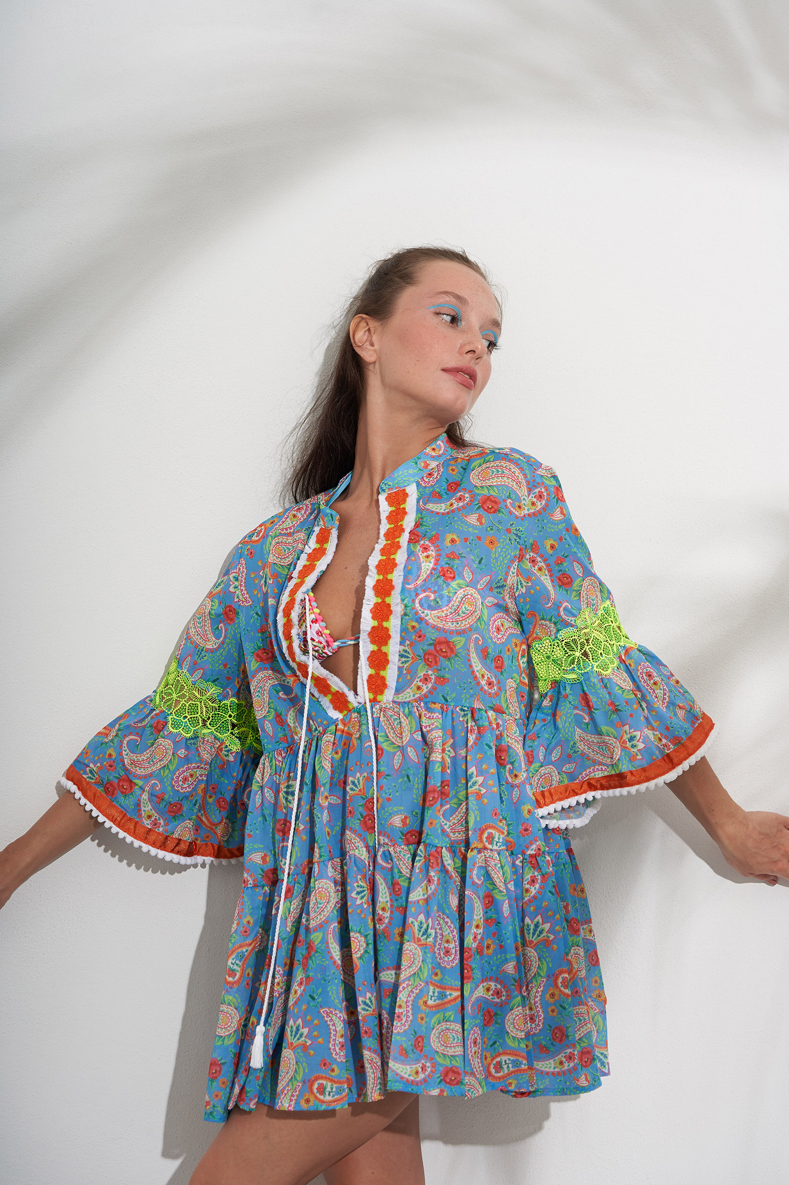 Caftano corto in cotone, fantasia “Papeete”; inserti in pizzo macramé sulle maniche, giochi di frange e passamanerie su scollo e fondo maniche.