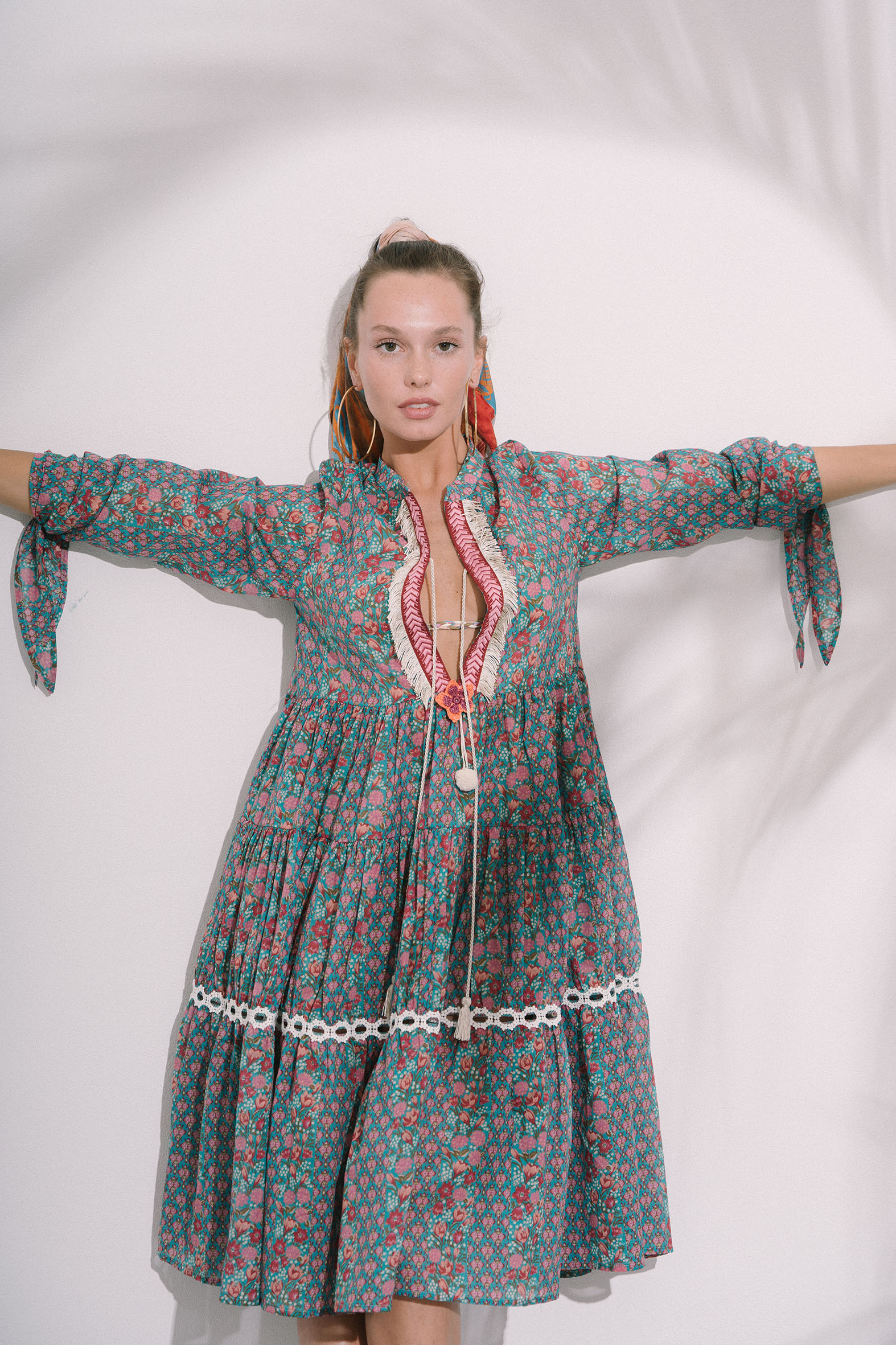 Caftano lungo in voile di cotone, fantasia “Jakarta”; maniche con allacciatura a fiocco; giochi di frange, passamanerie, fiore crochet fatto a mano e pom-pom sullo scollo; nastro decorativo tra le balze.