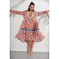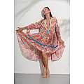 Caftano lungo fantasia “Papua”; maniche con allacciatura a fiocco; giochi di frange, passamanerie, fiore crochet fatto a mano e pom-pom sullo scollo; nastro decorativo tra le balze.