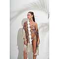 Kimono in voile di cotone, fantasia “Eden”; lunga frangia su maniche e finale abito; lacci di chiusura interni, bordatura con raffinato nastro macramé.