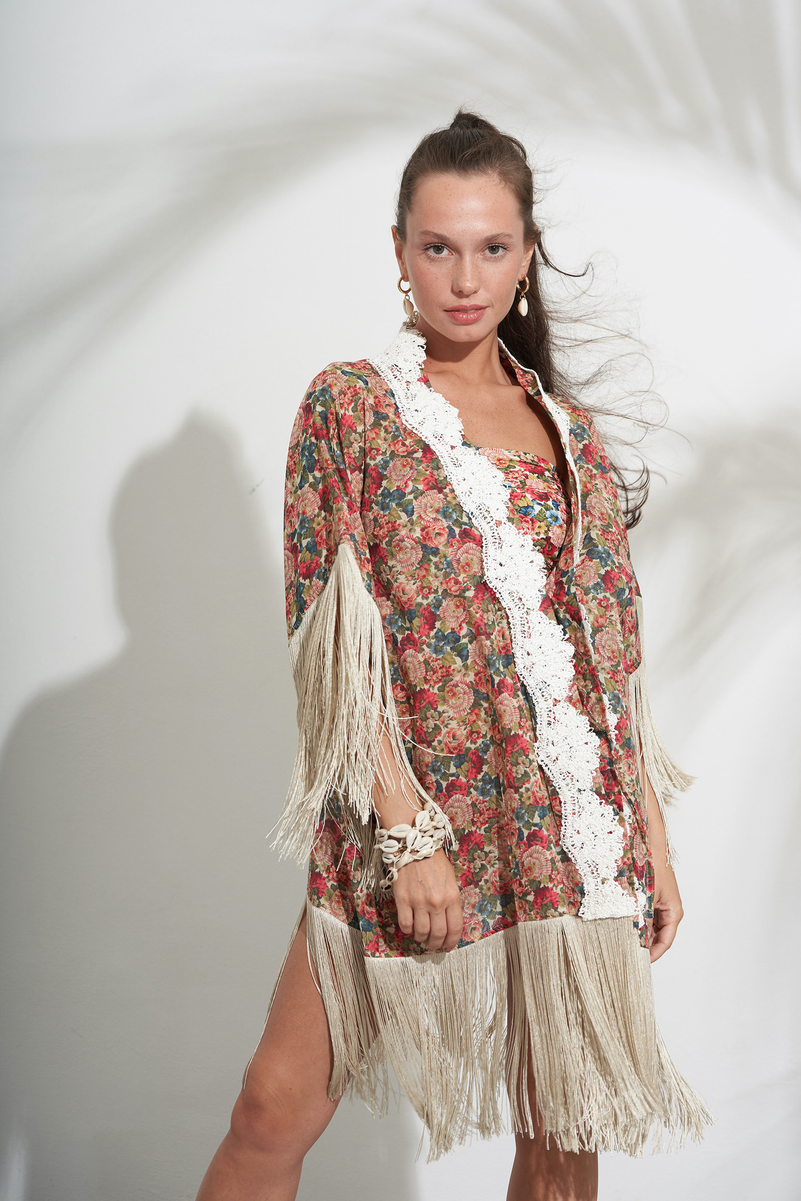 Kimono in voile di cotone, fantasia “Eden”; lunga frangia su maniche e finale abito; lacci di chiusura interni, bordatura con raffinato nastro macramé.