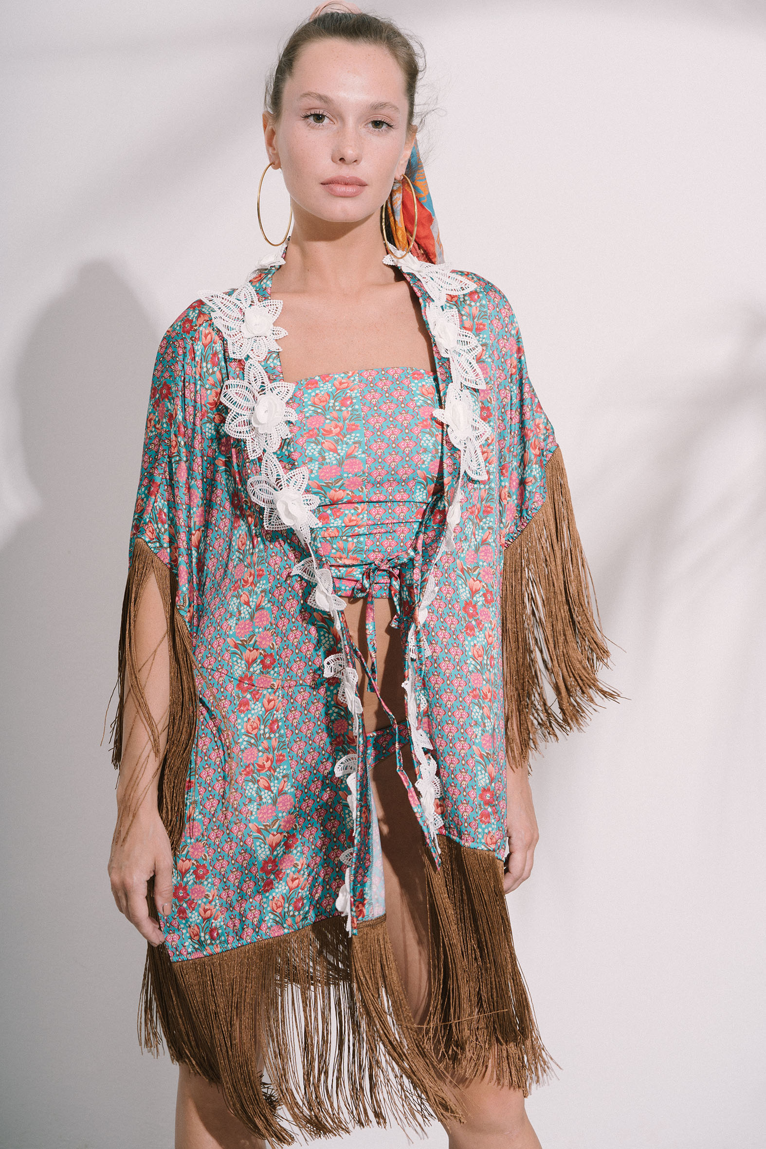 Kimono in raso, fantasia “Jakarta”; lunga frangia su maniche e finale abito; lacci di chiusura interni, bordatura con raffinato nastro macramé floreale.