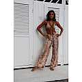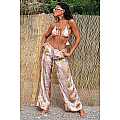 Pantalone Palazzo in raso, fantasia “Hiva Oa”; elastico morbido in vita con coulisse; lacci con nappine colorate sui finali; tasche laterali.