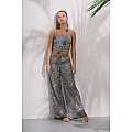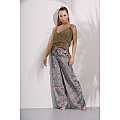 Pantalone Palazzo in raso, fantasia “Jakarta”; elastico morbido in vita con coulisse; lacci con nappine colorate sui finali; tasche laterali.