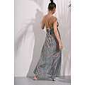Abito lungo a schiena nuda in voile di cotone; fantasia “Jakarta”; allacciatura al collo o sulla schiena con fettuccia in lycra multi-color intrecciata a mano; raffinato nastro sotto petto in macramé.